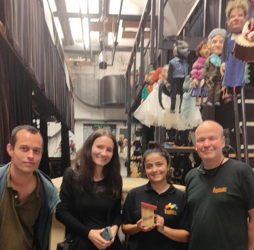 Wir durften sogar hinter die Kulissen zu den Puppenspielern und haben dort unser kleines Geschenk, speziell für die Augsburger Puppenkiste, überreicht.